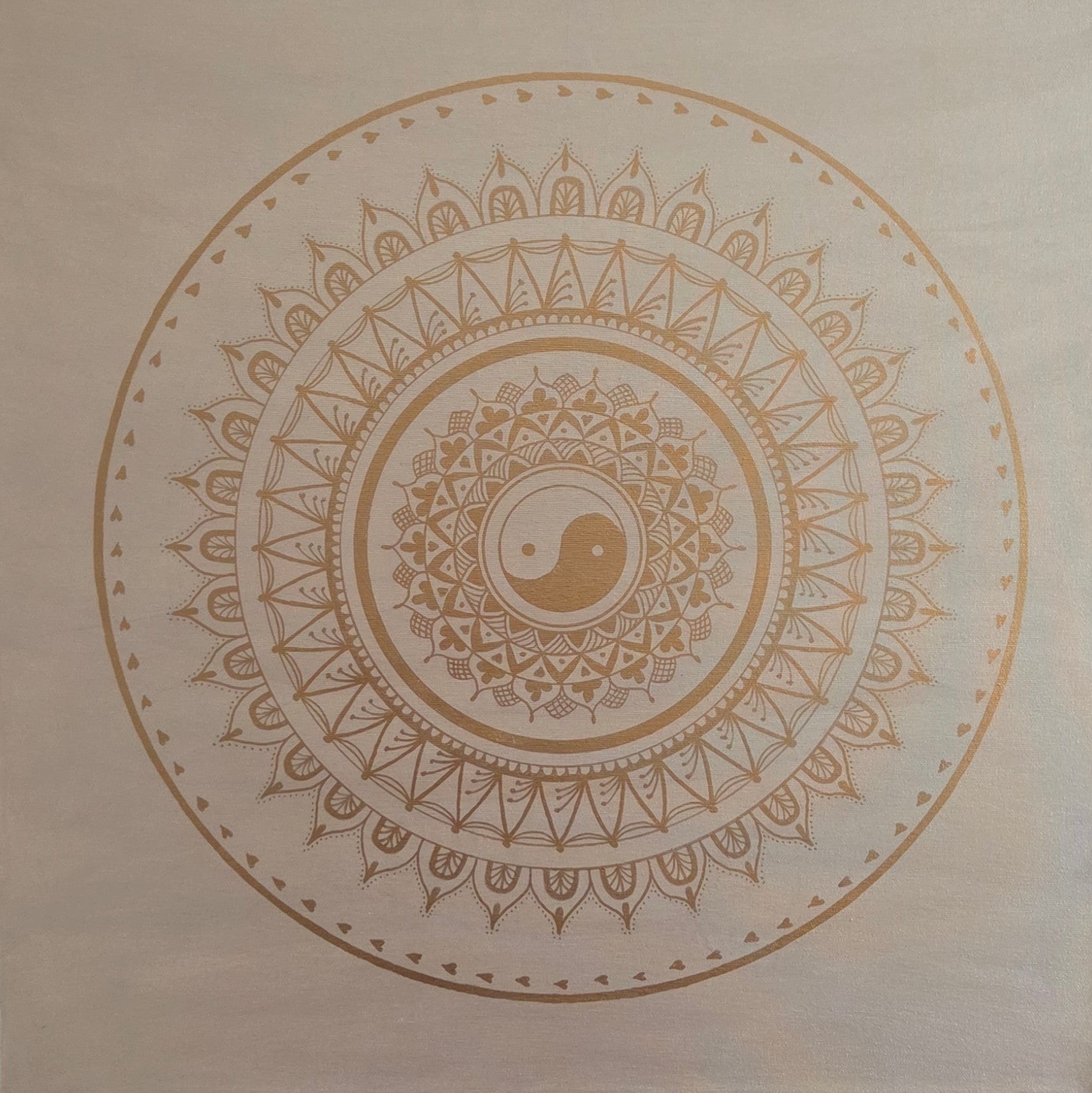 Plátno velikosti 60 x 60 cm. Na plátno je použita béžová akrylová barva a bronzová akrylová fixa, plátno je bez fotografie uprostřed. Plátno je bez rámu a má tloušťku 4 cm.
