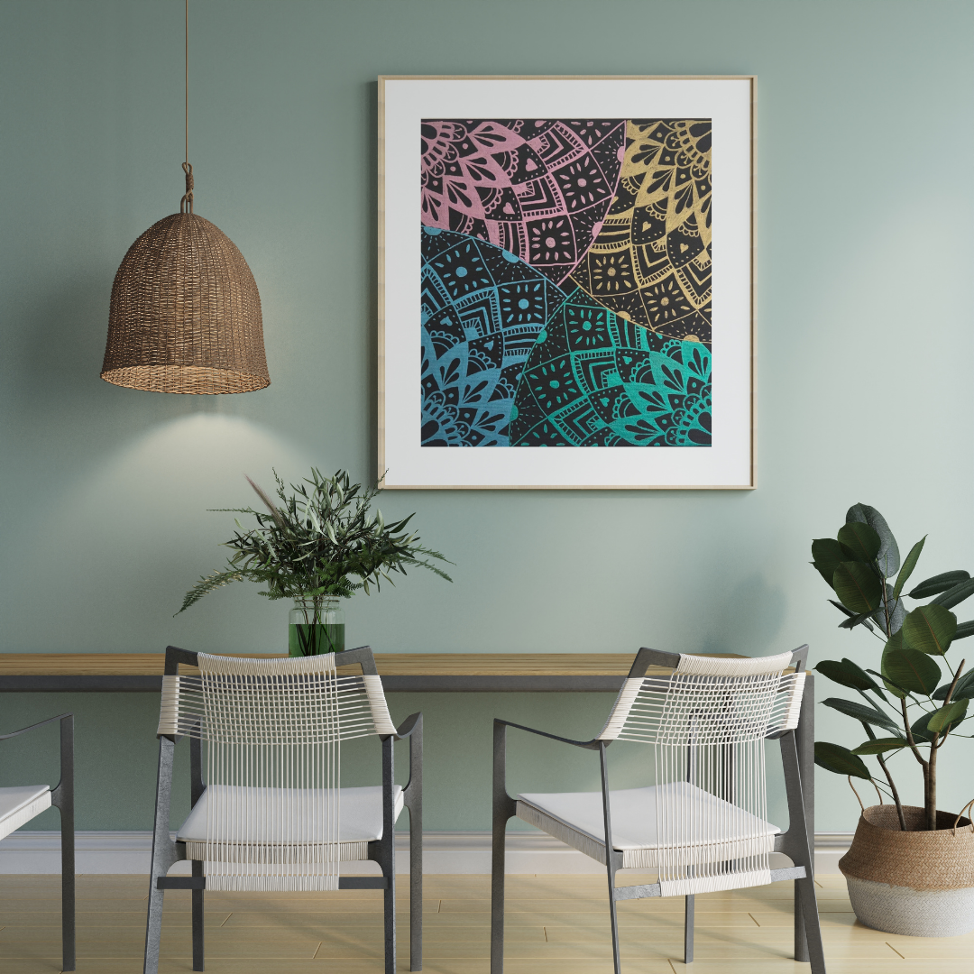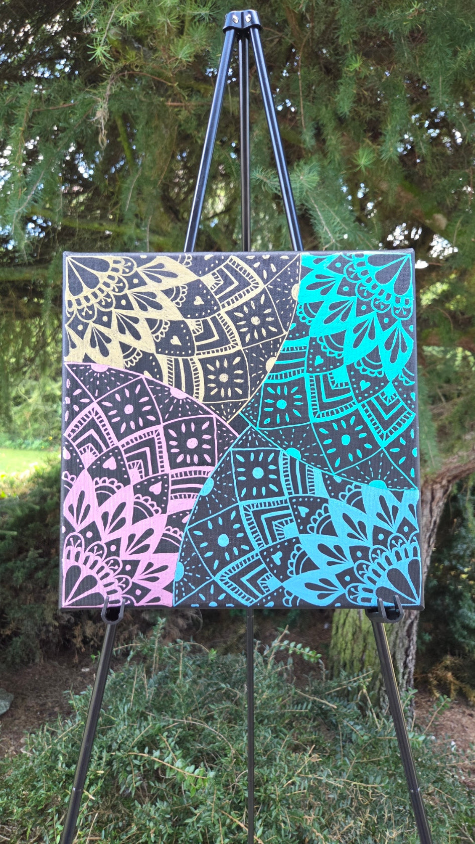 Plátno velikosti 30 x 30 cm. Na plátno je použita akrylová černá barva a barevné fixy. Plátno je bez rámu a má tloušťku 2 cm.