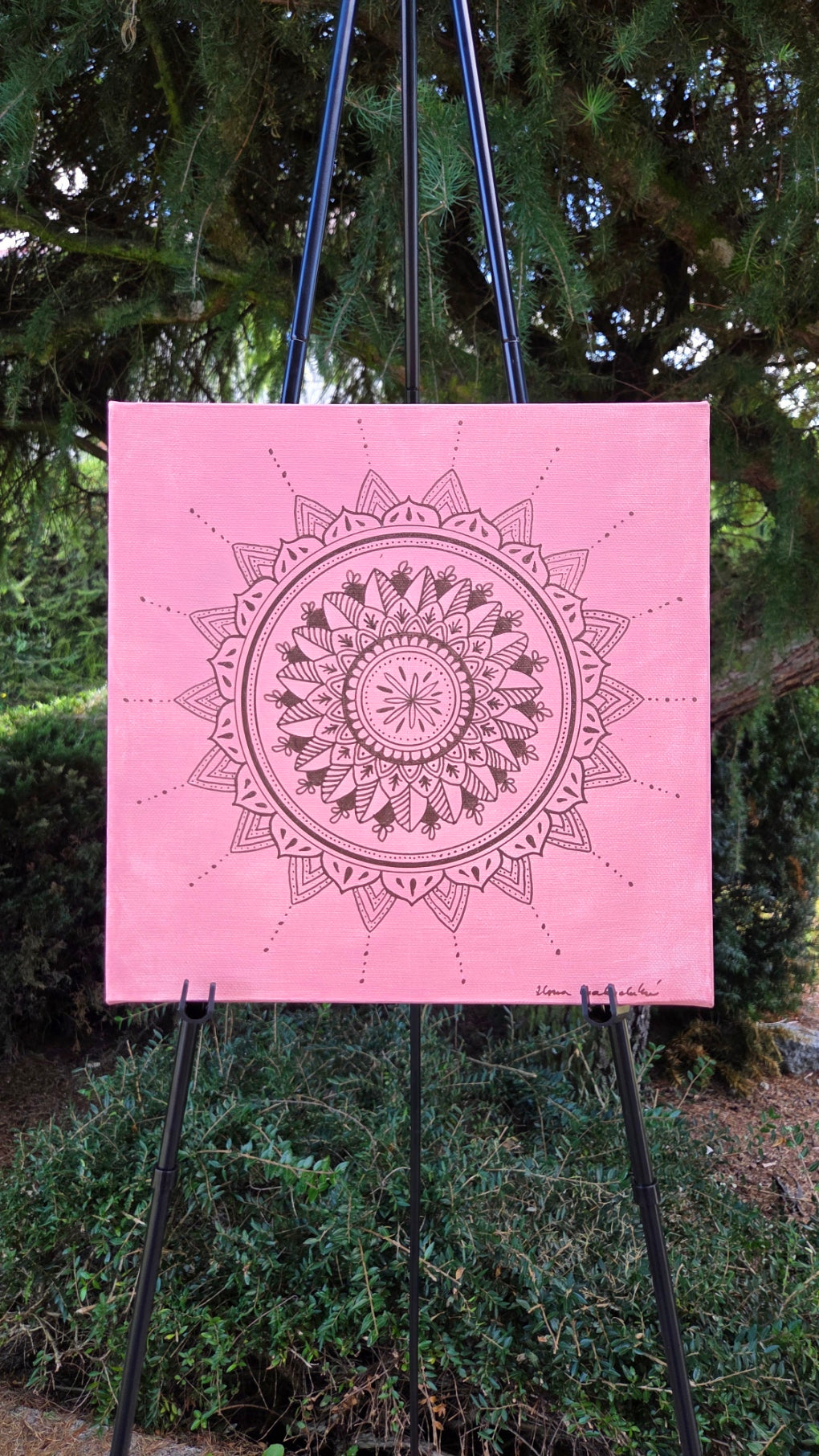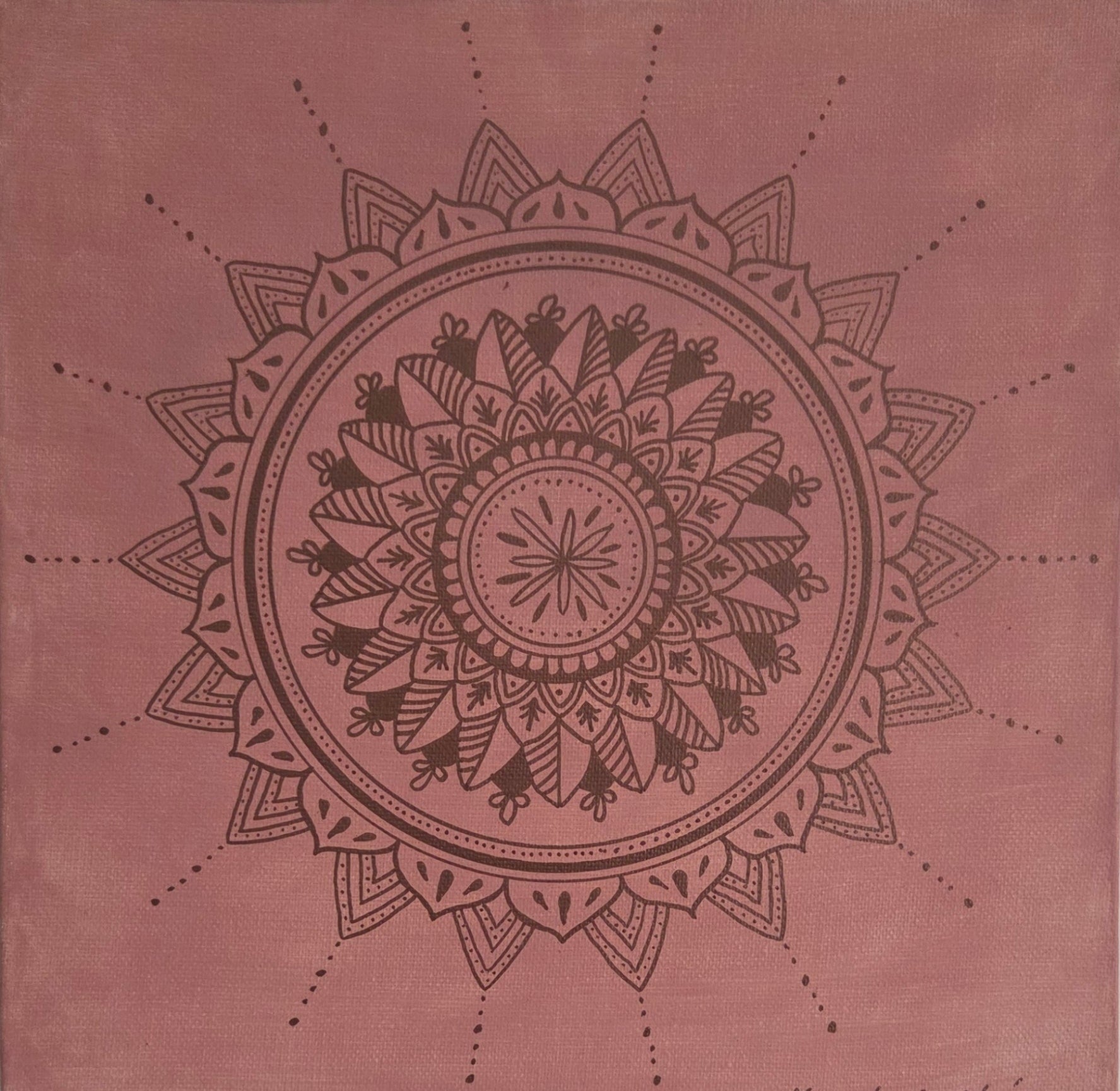 Plátno velikosti 30 x 30 cm. Na plátno je použita růžová akrylová barva a bronzová akrylová fixa, plátno je bez fotografie uprostřed. Plátno je bez rámu a má tloušťku 4 cm.