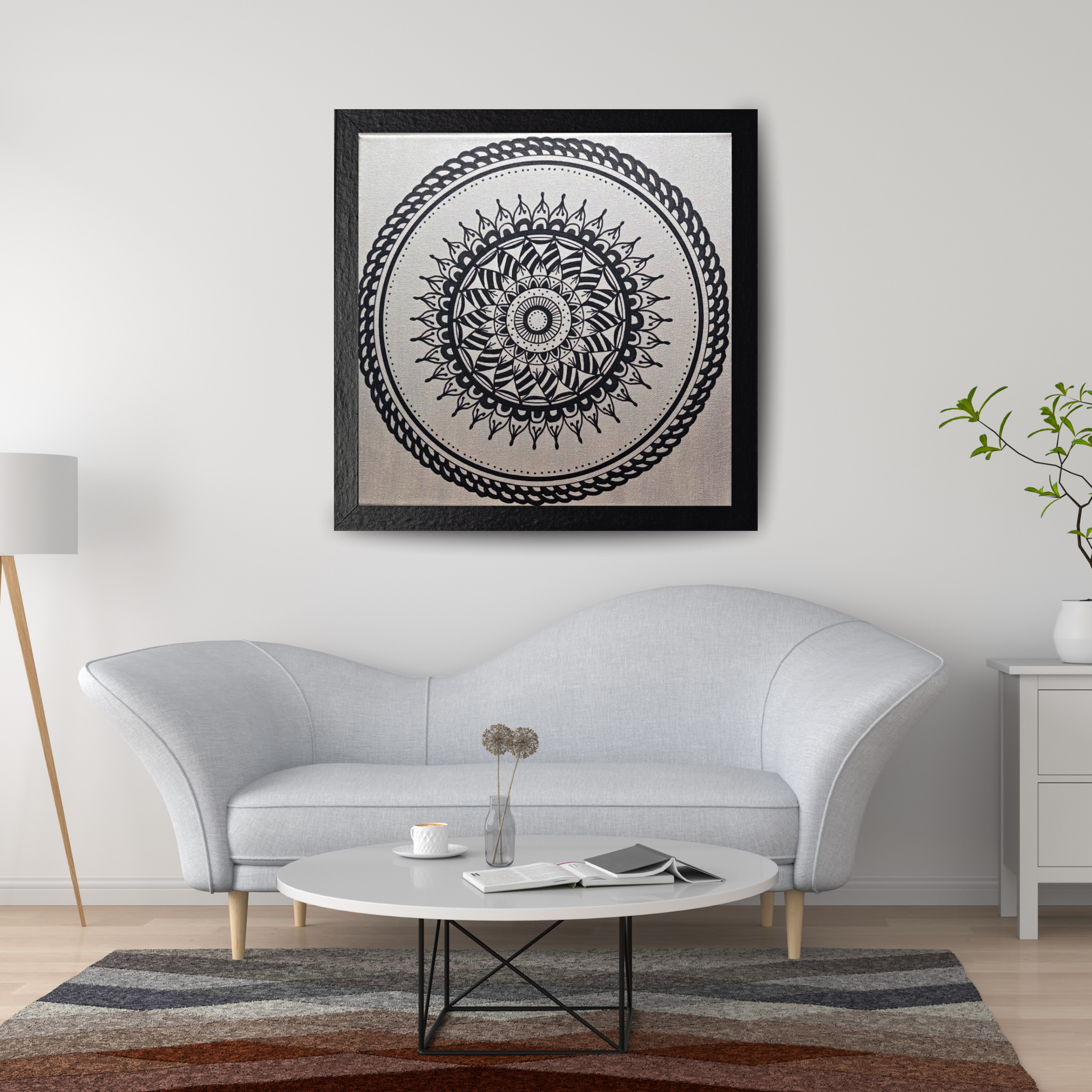 Plátno velikosti 30 x 30 cm. Na plátno je použita stříbrná akrylová barva a černá fixa, plátno je bez fotografie uprostřed. Plátno je bez rámu a má tloušťku 2 cm.