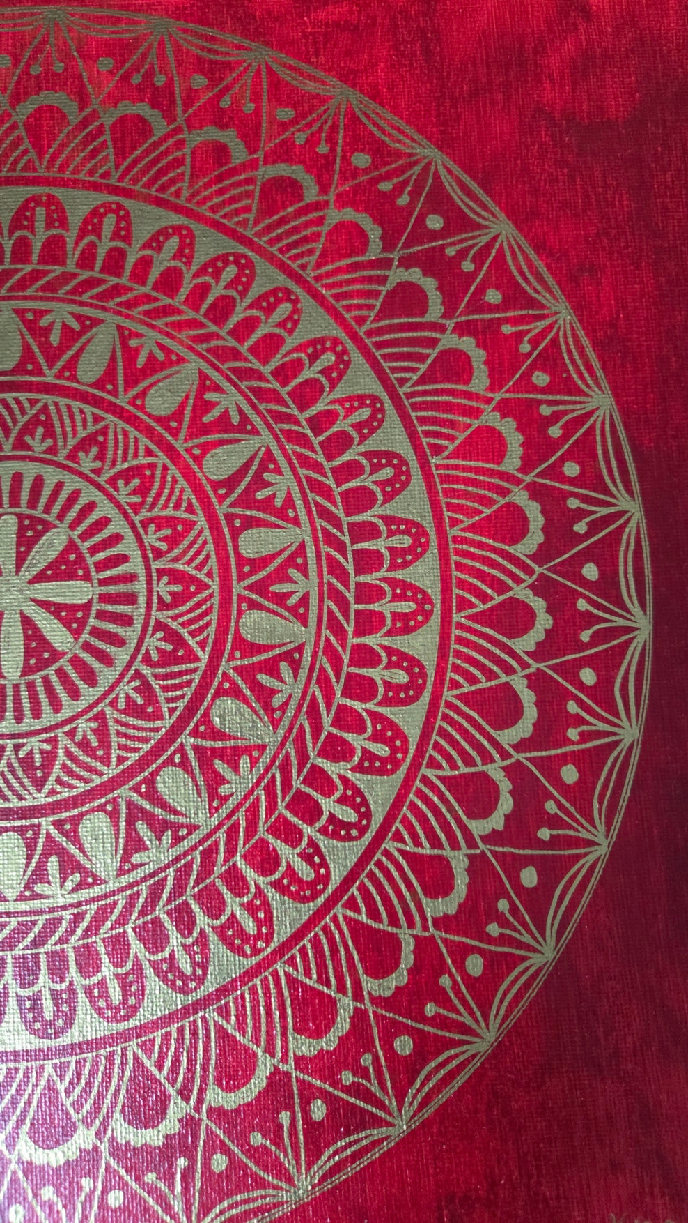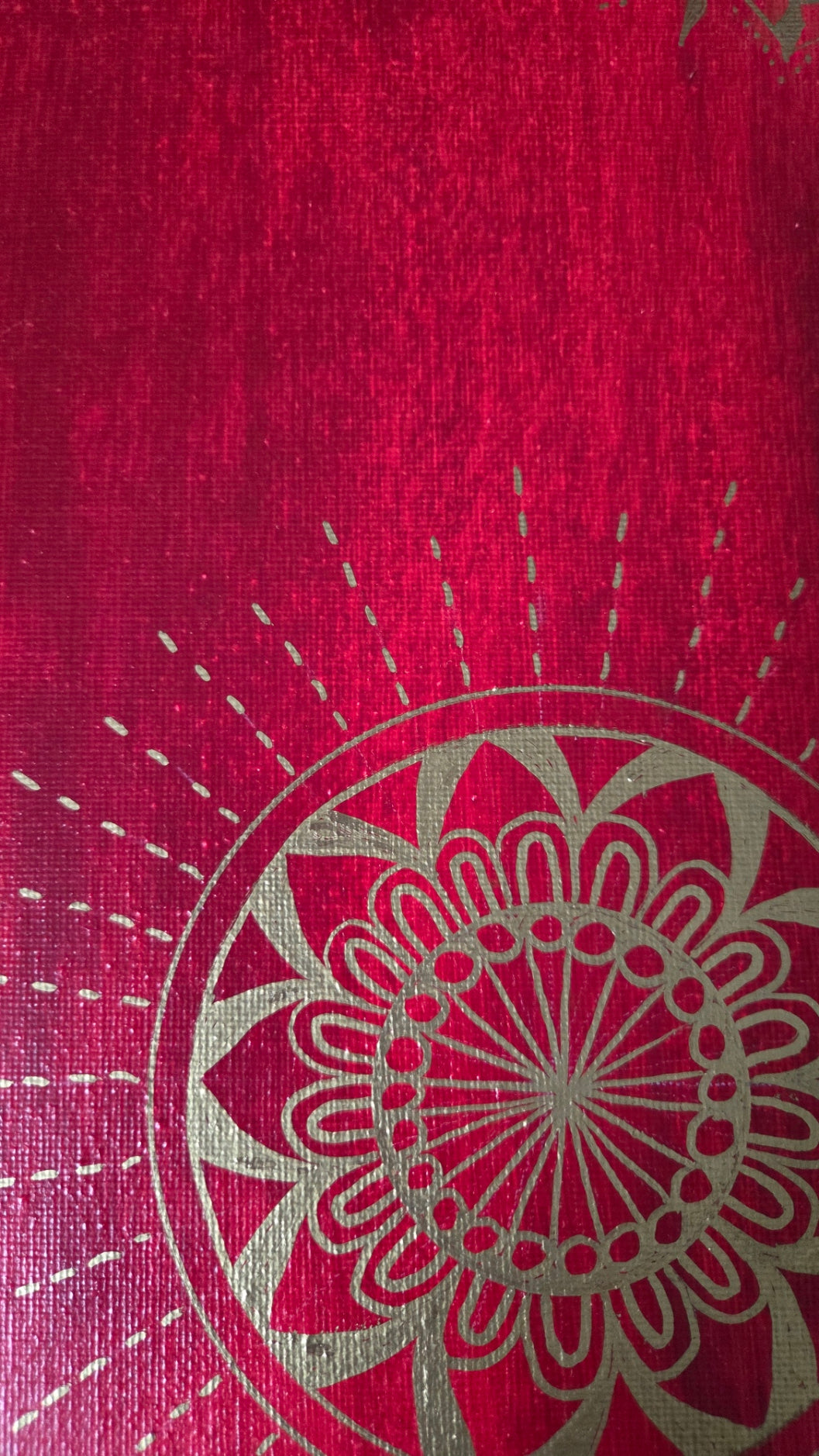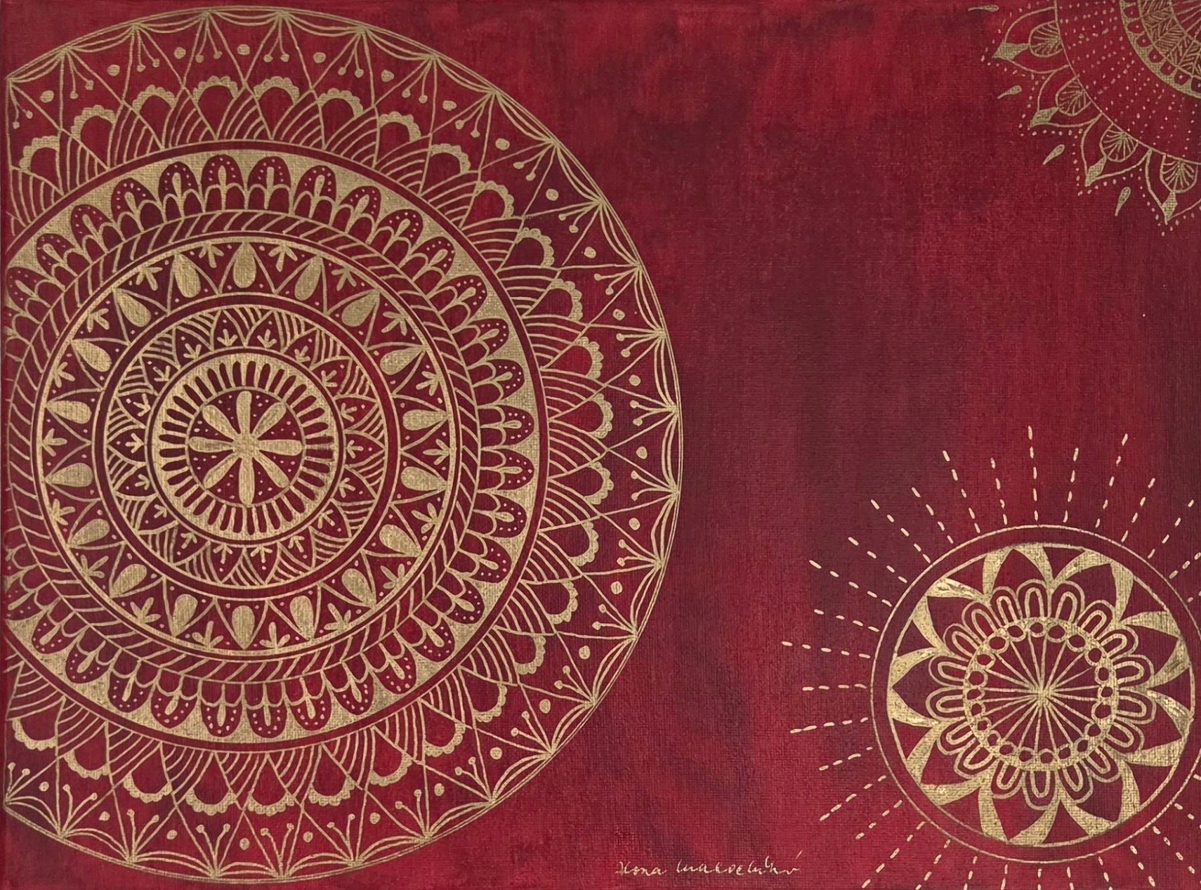 Plátno velikosti 30 x 40 cm. Na plátno je použita akrylová červená barva a zlatá fixa, plátno je bez fotografie. Plátno je bez rámu a má tloušťku 1,5 cm.