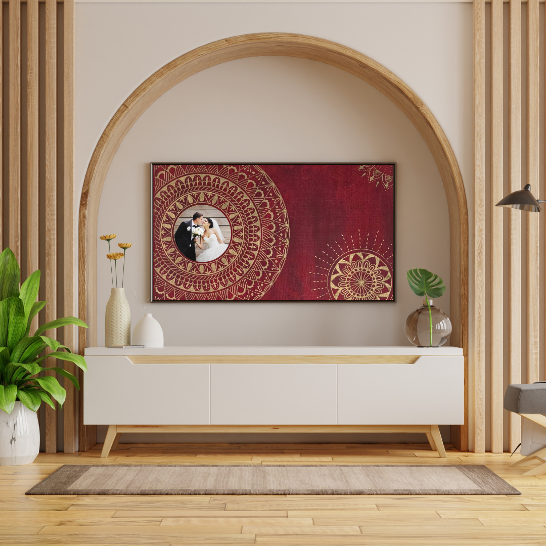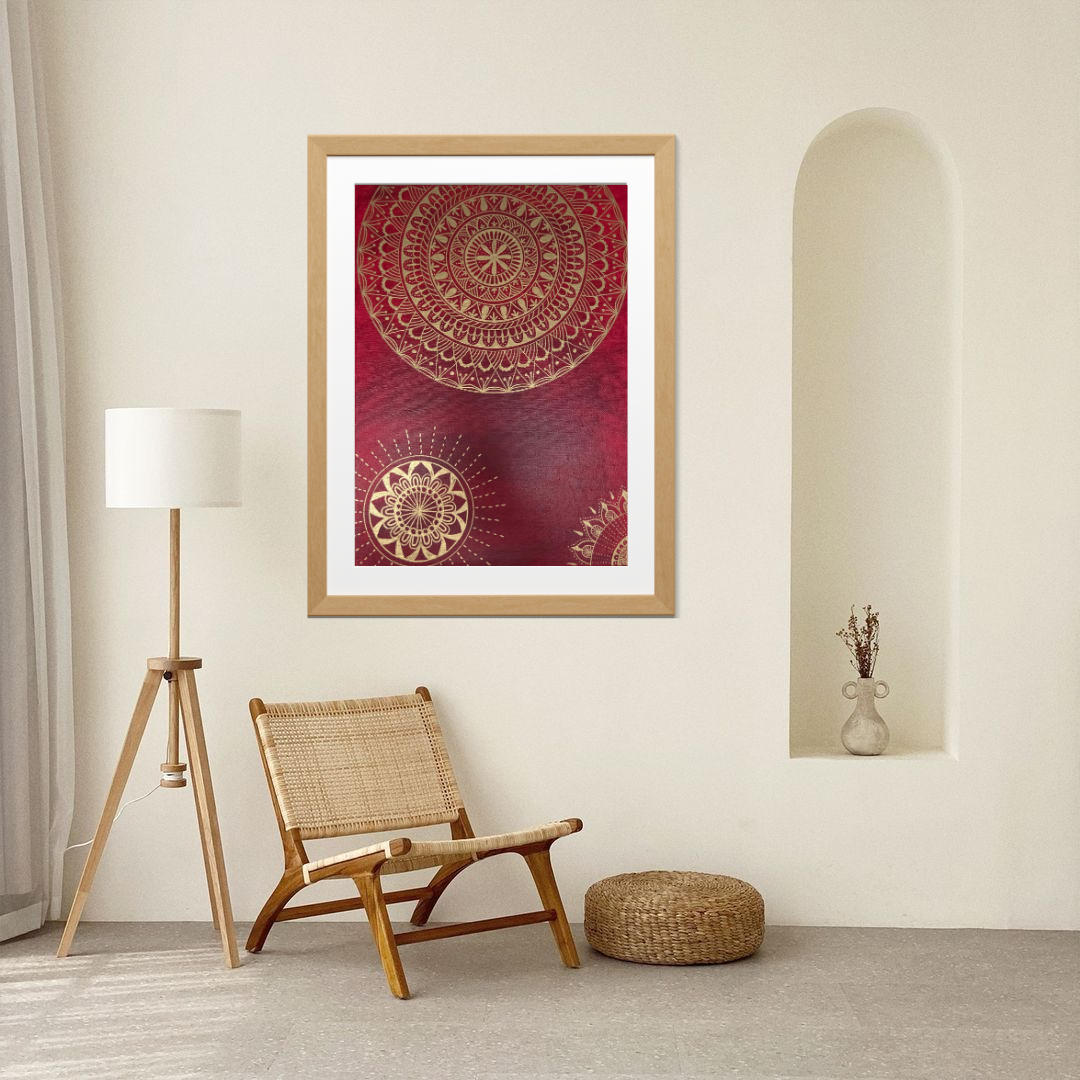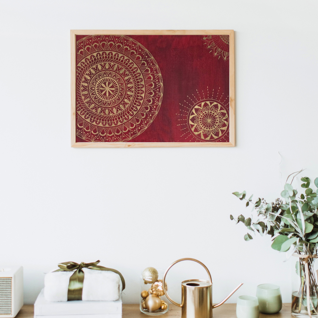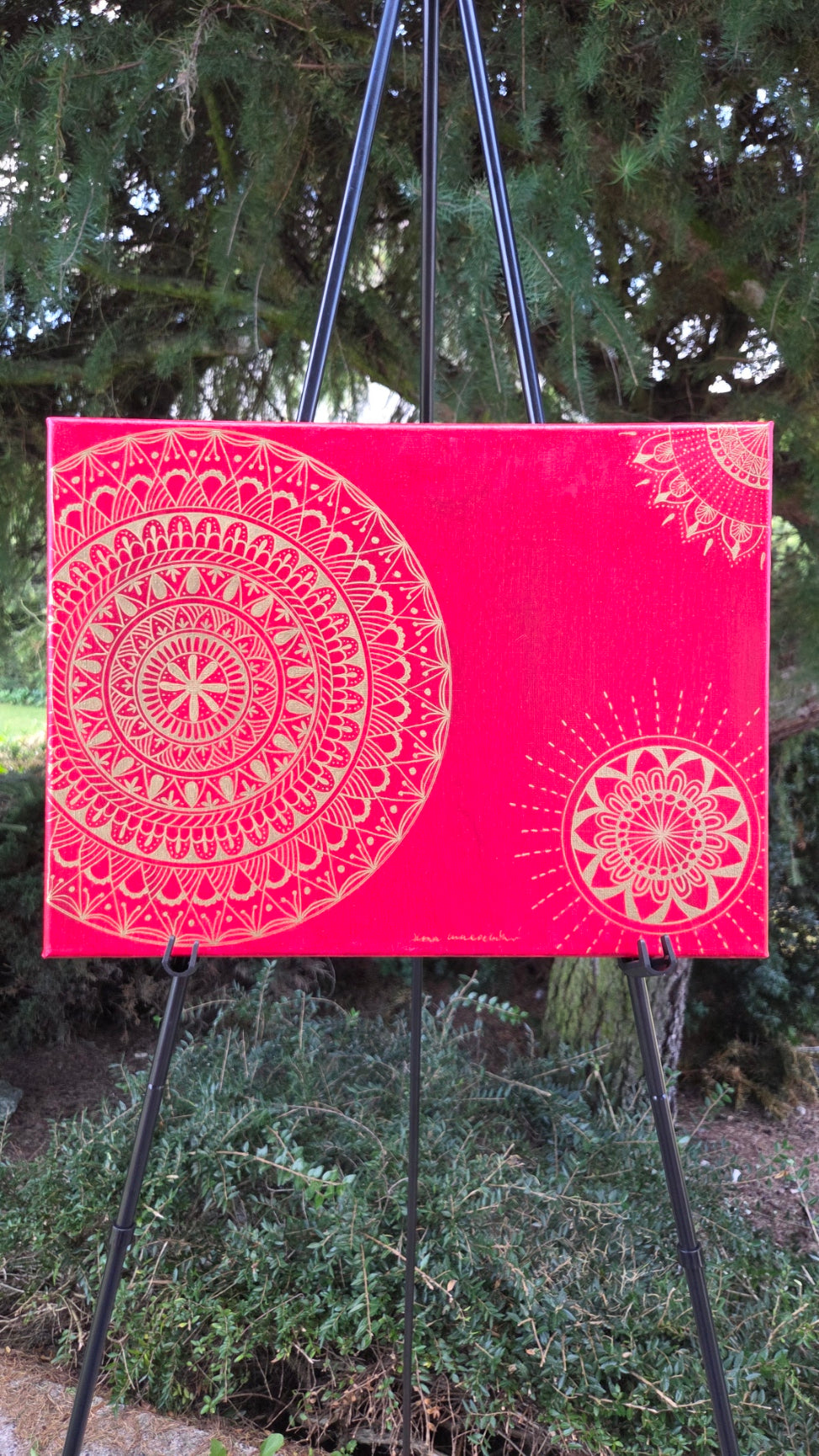 Plátno velikosti 30 x 40 cm. Na plátno je použita akrylová červená barva a zlatá fixa, plátno je bez fotografie. Plátno je bez rámu a má tloušťku 1,5 cm.